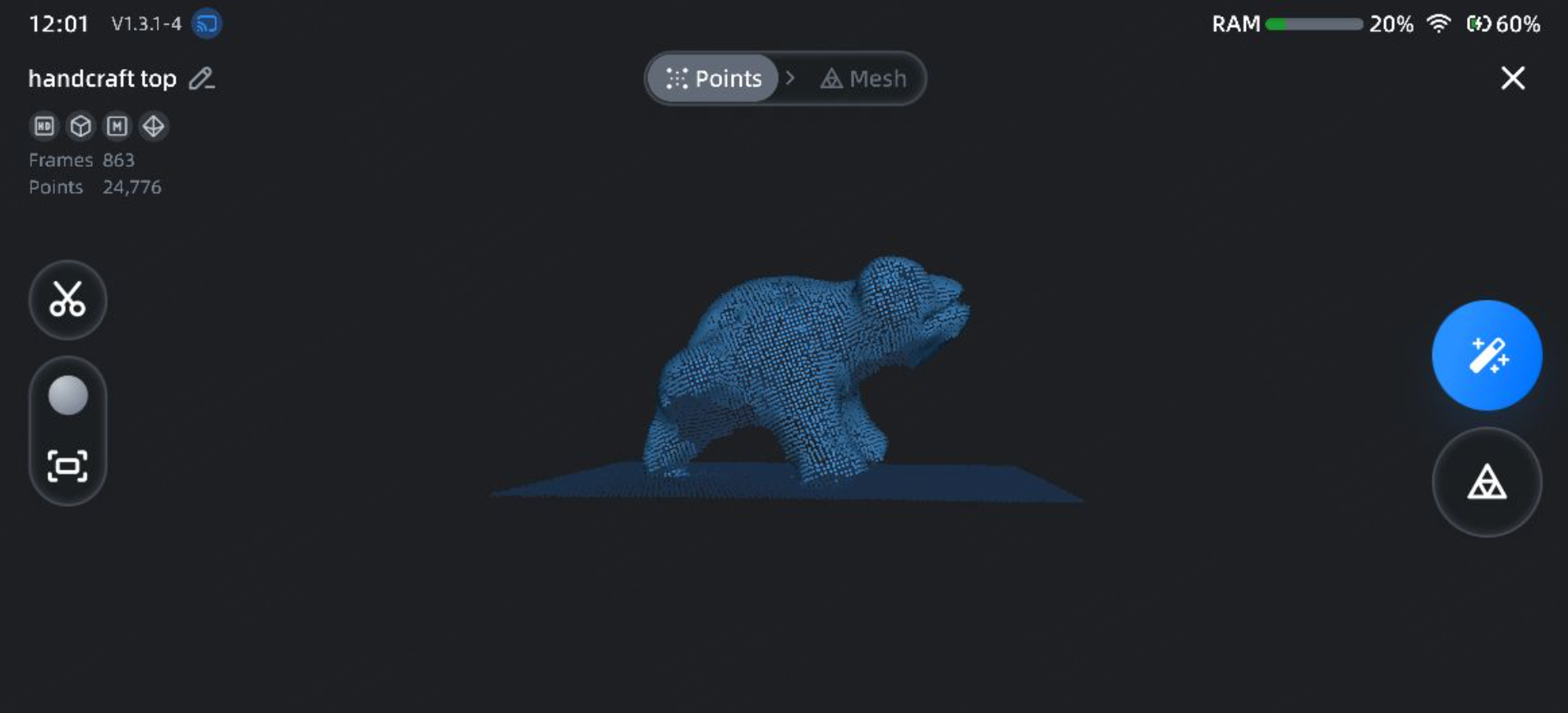 Back in the workspace, select the Alignment result and click on One-click processing or Generate mesh to obtain the complete model of the digitised object.